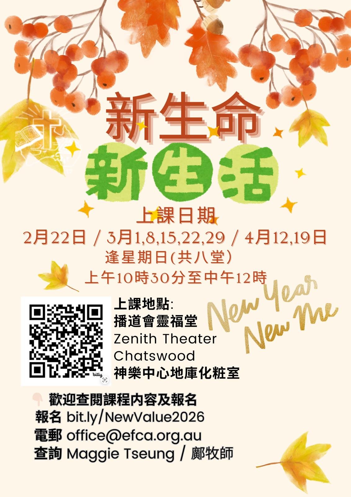 由鄺偉志牧師及鄺黃麗明師母全新重整的「新生命新生活」課程,適合初信者、從未上過本課程者及盼望重整個人屬靈生命者參加,詳情請參考右邊海報。